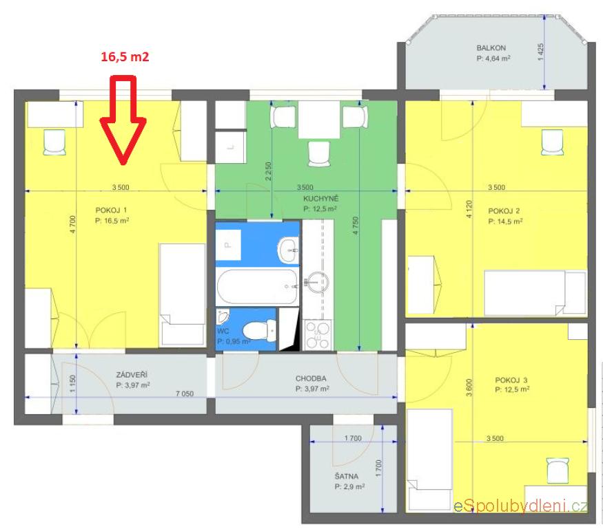 Samostatný zařízený pokoj 16,5 m2 v bytě 3+1. ..