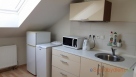 Kuchyně je vybavená nádobím, ledničkou, kombinovaným sporákem, mikrovlnkou, rychlovarnou konvicí, stolem a židlemi.