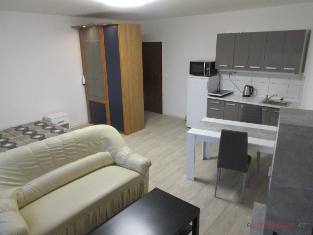 Pronájem kompletně vybavené garsonky 30 m. V jednom rohu kuch. linka s dřezem + jídelní stůl, druhý roh sedačka + obývací stěna, třetí roh ložnice – 2 postele + noční stolky, čtvrtý skříně a vchod. Vhodné pro 1–2 osoby. Vybavení na pokoji - lednička, mikrovlnka, konvice, vařič, nádobí, síť proti hmyzu, TV přípojka, internet. Vlastní ovládání topení. Na chodbě pračka. Na patře 4 takové minigarsonky. WC a koupelna společná pro 2 pokoje, ale vlastní umyvadlo a skříňka. TESCO 700m, MHD 50 metrů. 1 os.-cena 9000,- , 2 os.-12000,- včetně energii. Kauce = 1 nájem. Nástup 1.10. 2025.
